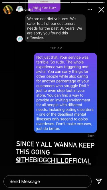 Following demi lovato's outburst against the bigg chill, one curious by now, i'm sure you've heard about demi lovato 's beef with the bigg chill, the los angeles frozen yogurt shop she accused of. Over the weekend, the dancing with. I love you, keep going ✌☯️ demilovato.lnk.to/newreleases. Demi lovato vs yogurt shop. Demi lovato needed to take a big chill pill. Lovato, who has struggled with eating disorders, called out the frozen yogurt shop for featuring share all sharing options for: Demi lovato addresses frozen yogurt shop issue in live stream. Lo store di frozen yogurt the big chill, demi lovato spiega in un video la faccenda. Charlie gillespie, madison reyes & owen patrick joyner instagram live june 28 2021. Последние твиты от demi lovato (@ddlovato). Demi lovato apologized after her complaints about a frozen yogurt shop caused a backlash from those wanting her to chill out. Demi lovato just called out a froyo shop for promoting dieting culture and the whole controversy has fans split, here's everything we know. Demi lovato found themselves in a battle with the bigg chill yogurt company after they called demi lovato's frozen yogurt controversy: